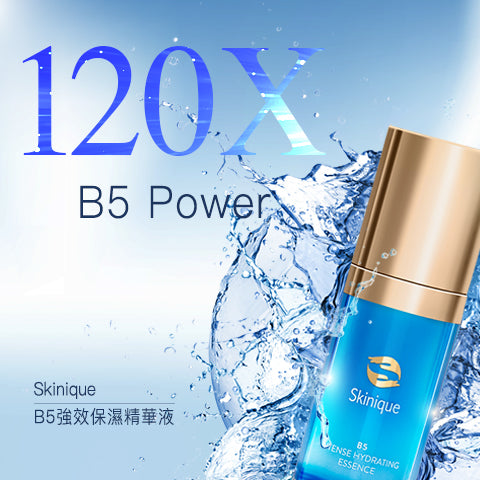 醫生配方,獨家技術調配出極高濃度的維他命原 B5 精華液,【120 倍 B5 Power】讓肌膚吸收大量水分,極緻補水,同時鎖水,強化修復受環境等因素破壞的細嫩肌膚,回復水嫩健康。